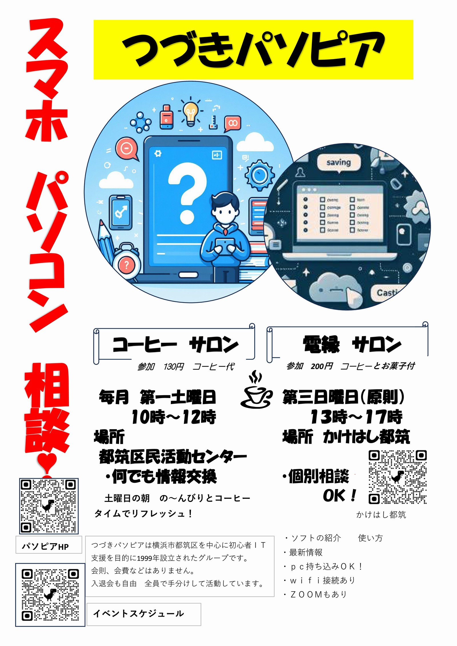 14:30頃からパソコン、タブレット等の相談を受けます。ただし重症の故障?で時間が掛かりそうなものは申し出てください。(事前にメールでもOKです)別の場所に避難して対応する場合があります。特にOSの再インストールなど2時間程度で完了しない可能性のあるもの。