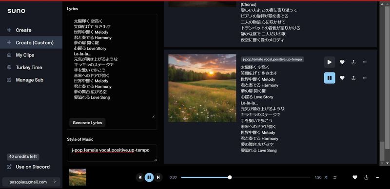 Create(Custom)を使うと歌詞を自分で作詞したもの、他の人、AIが作ったものも使うことが出来ます。これが分かって、日本語の歌詞が簡単に入れることが出来ました。 音楽界を震撼させる新技術、「Suno AI」をご紹介します。この驚異のAIは、ただのプロンプト入力だけで、プロレベルの歌手を生成し、あなたの思い描く曲を現実にします。音楽生成AIもいろいろなものが出ていますが、この【Suno AI】という音楽生成AIはすごいです。 Suno https://app.suno.ai/ 物凄い!テキストだけで曲、歌詞、歌声を作れる驚異の音楽生成AI - つみかさね https://3yokohama.hatenablog.jp/entry/2023/12/11/194722 |